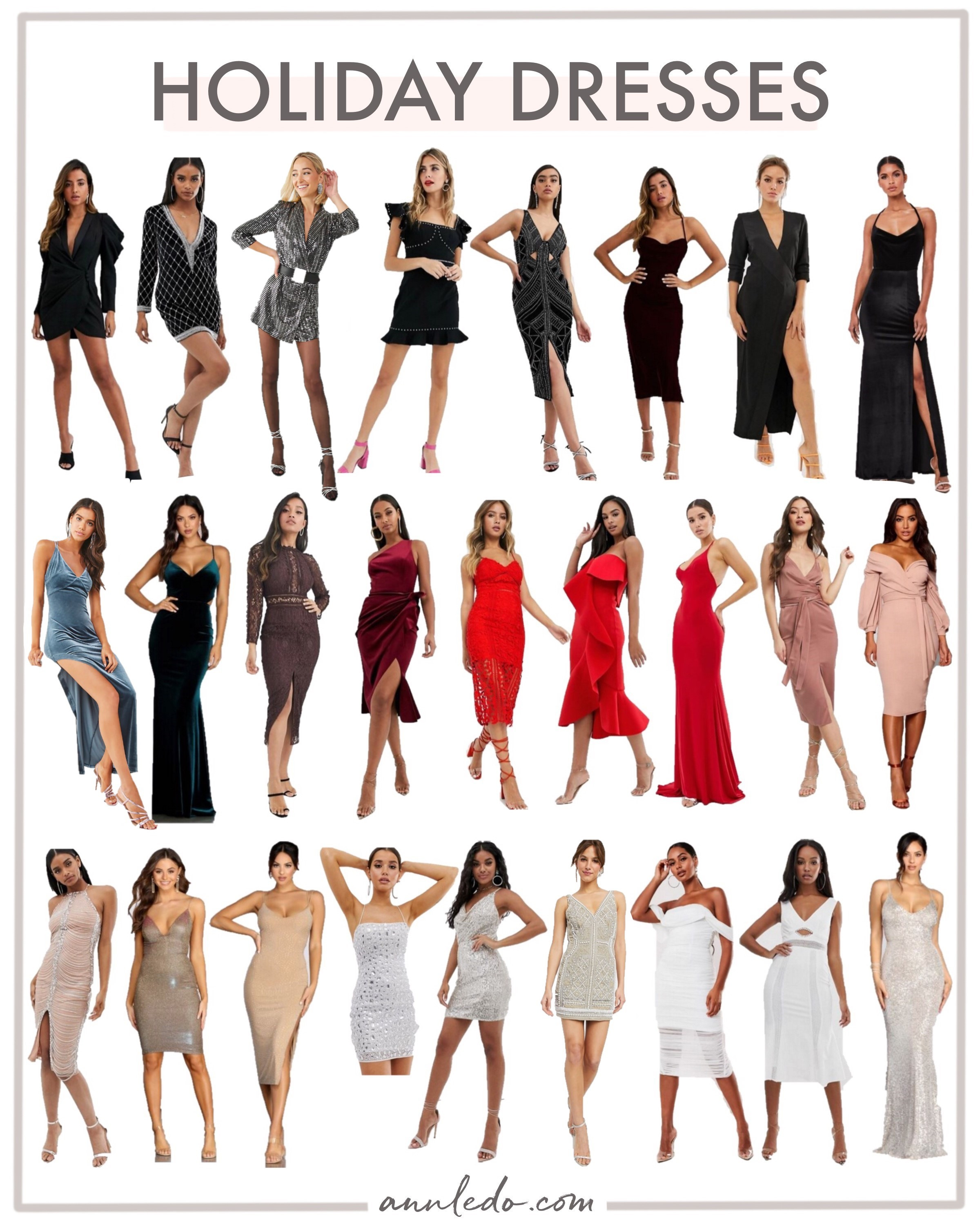 Tis’ the season for glowing Christmas lights, cozying up with some eggnog, and kissing at midnight. Sparkly sequins, luxurious velvet, and classic little black dresses – nothing puts me in a more festive mood than some fun + extravagant dresses!